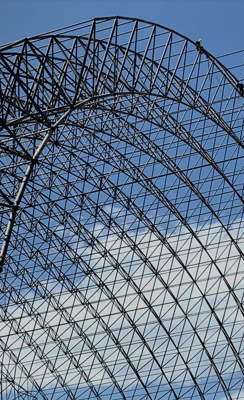 干煤棚網架主要搭建機構為平面剛架、平面桁架、平面拱以及柱面網殼結構。